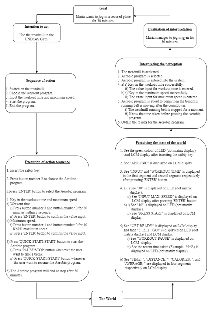 She needs to attempt the “try and error” process to use the treadmill as the treadmill interface provides different functions for the same button. Maria is a little bit confused at first to determine the function of the buttons. She is unable to use the treadmill properly as she is not used to it. She has to spend her time more on pushing different buttons instead of jogging. It affects her plans to do other exercise routines as she has arranged specific time for each routines.