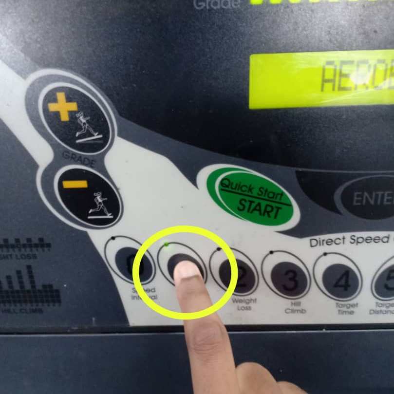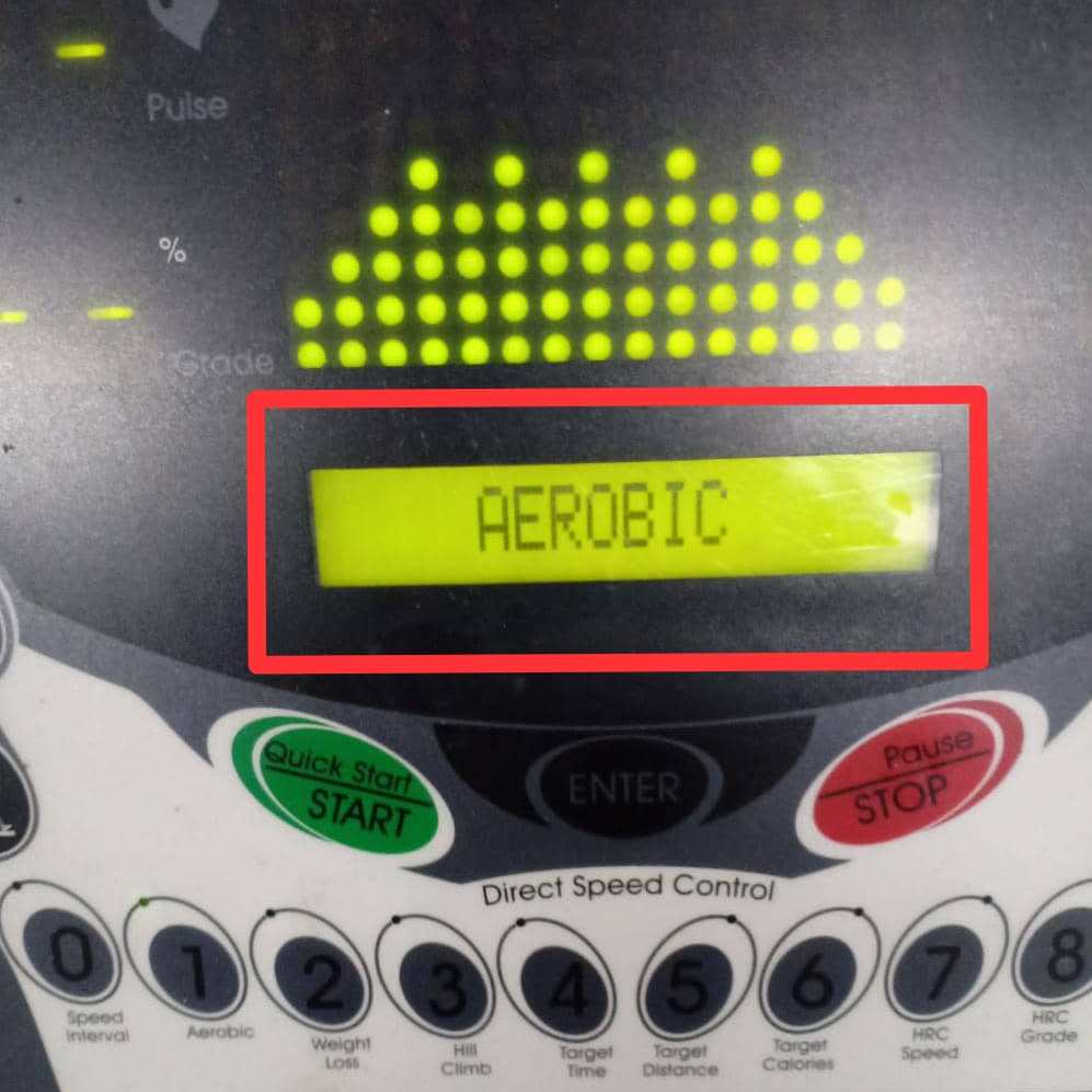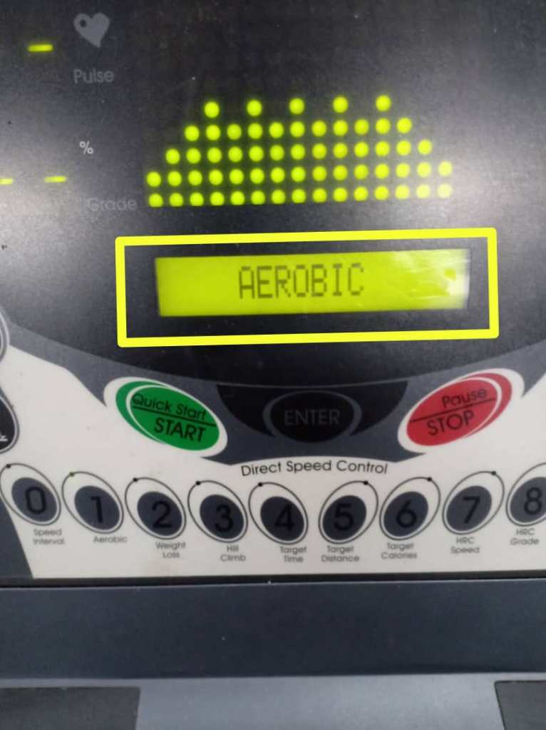 The small green light is turned on when the button is pressed meanwhile the LCM will display the selected workout program which is Aerobic program.
